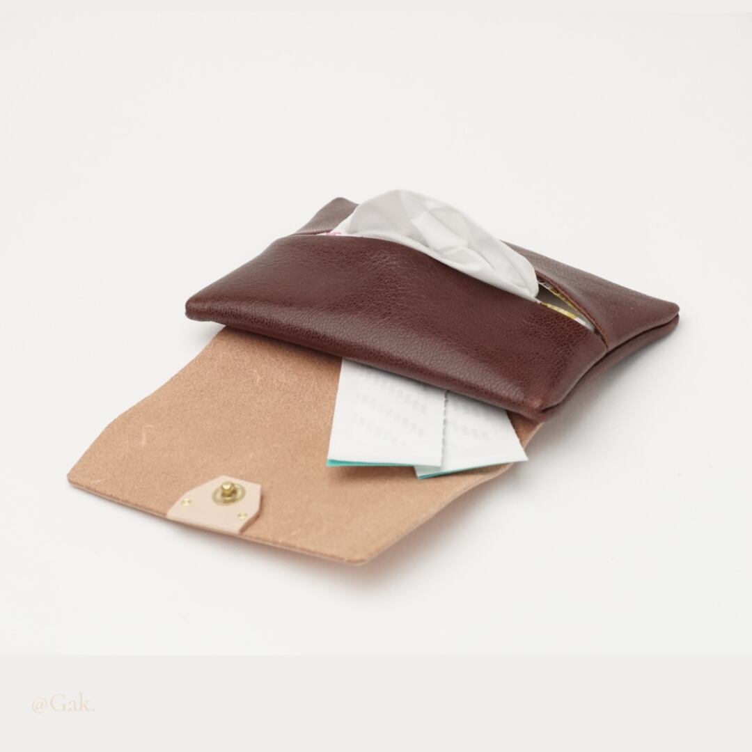 ティッシュポーチ。 蓋がついているため、出番が少ない時にもホコリ等からティッシュを守りいつでも清潔に使えます。バッグにいれっぱなしでも安心。 また、蓋裏にはフリーポケットが付いているのでいざという時のためにバンソウコウ等を収納できます。 プチギフトにもオススメ。 サイズ▷約11.5×8.3×1.3cm 素材▷蓋:牛革、本体:山羊革 仕様▷ティッシュポケット×1、フリーポケット×1、スナップボタン開閉